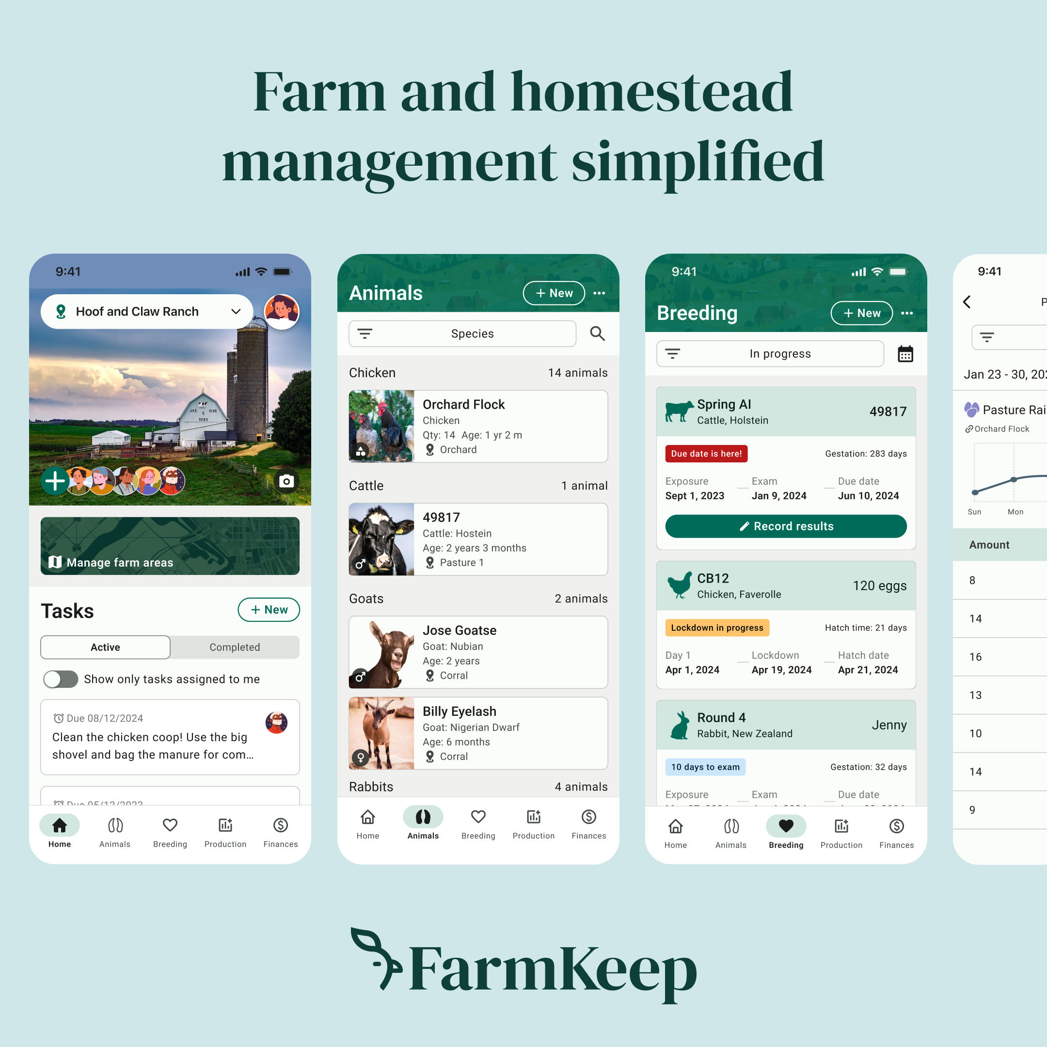 FarmKeep is the all‑in‑one farm management app built for homesteads, hobby farms, and small family ranches. Stay organized and save time with record keeping, by effortlessly tracking your animals, breeding, production (eggs, milk, honey, wool), finances, and even tasks and land mapping—all from the ease of your mobile device. With support for over 1,200 species and breeds, FarmKeep adapts to virtually any operation, whether you raise poultry, goats, rabbits, cattle, emus, alpacas—or a little bit of everything.